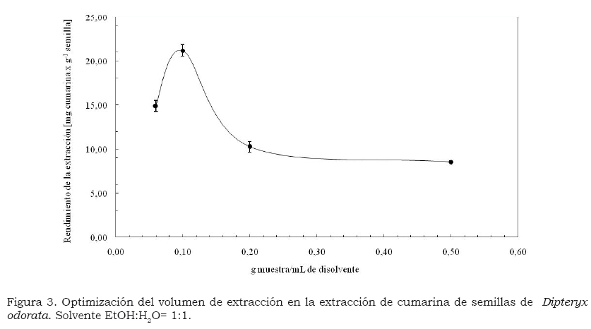 La figura 3 resumen el comportamiento encontrado en esta optimización del procedimiento de extracción de cumarina, donde una relación óptima de 0,1 g mL-1. Este resultado es consistente con los encontrados mediante el análisis de absorción de cumarina en placas de TLC, verificando la efectividad del análisis de TLC en estimaciones cuantitativa de cumarina. Los resultados demuestran que existe un compromiso importante al seleccionar el volumen de disolvente a emplear, pues en exceso o por defecto, puede afectar de manera significativa la cantidad de cumarina extraída. El empleo de un volumen de disolvente por defecto, problemas de solubilidad pueden limitar la cumarina extraída, pues puede ocasionar una saturación del mismo en cumarina, por el contrario, un aumento del volumen del disolvente, puede favorecer una transferencia masa solido al líquido excesivo, pero según los resultados, este aumento en la relación volumen/masa puede afectar la eficiencia de la extracción mediante ultrasonido, una alta dispersión (dilución) de las partículas en el disolvente, y una disminución de la energía de las ondas de choque con las partículas del material a extraer.