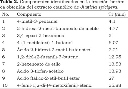 La fracción hexánica es un líquido amarillo, aromático y se analizó por cromatografía de gases acoplada a espectrometría de masas, se compararon los espectros con la colección NIST y se detectaron los siguientes compuesto: 4-metil-3-pentenal; 2-hidroxi-2-metil-butanoato de metilo; 3,4-epoxi-2-hexanona; 1,2-diol-(2-furanil)-3-buteno; 3,4-epoxi-2-hexanona; 4-(1-metiletoxi)-1-butanol; ácido 2-hidroxi-2-metil-butanoíco; 2-hexenoato de etilo; ácido 3-tiofen-acético; ácido ftálico-2-etil-butil éster; 1-fenil-1,2-di-(4-metoxifenil)-eteno. Estos compuestos no se han reportado previamente en Justicia spicigera.