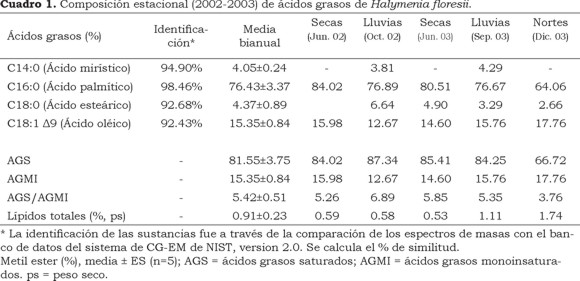 Los resultados de la composición bianual (2002-2003) de ácidos grasos se muestran en la Cuadro 1. El porcentaje total de lípidos de Halymenia floresii, en un periodo de dos años, varió entre 0.53 y 1.74 %. La mayor proporción de lípidos totales se reportó en la estación de nortes (1.74%), siguiendo la estación lluvias (0.58-1.11%) y secas (0.53-0.59%); no se encontraron diferencias significativas entre la estación de lluvias y secas (t: 1.069; p=0.397). Los análisis revelaron la presencia de ácidos grasos saturados y uno insaturado. El ácido palmítico (C16:0) fue el más abundante en las muestras colectadas durante las estaciones de lluvias (76.67-76.89%) y secas (80.51-84.02%) y ligeramente menor en la estación de nortes (64.06 %); no se encontraron diferencias significativas entre la estación de lluvias y secas (t: 3.119; p=0.089). Al comparar los niveles bianuales de ácidos grasos SAFA estos son significativamente más altos (81.55±3.75%) que los insaturados MUFA (15.35±0.84%). El ácido mirístico (C14:0, 4.05±0.24%) y esteárico (C18:0, 4.37±0.89%) se presentaron en menor proporción comparados con el ácido palmítico (C16:0, 76.43±3.37 %). De los monoinsaturados solo se detectó el ácido oleico (C18:1, 15.35±0.84%); no se encontró diferencias significativas entre la estación de secas y lluvias para el ácido oleico (t: 0.635; p=0.590). La proporción AGS/AGMI fue mayor en la época de secas y lluvias (5.26-6.89%) en comparación con la estación de nortes (3.76%). La proporción bianual promedio (AGS/AGMI) fue 5.42±0.51%.