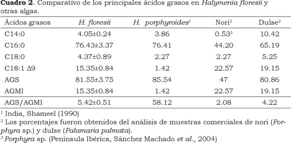 En general al comparar las concentraciones de ácidos grasos presentes en Halymenia floresii con las algas comerciales como el "nori" y "dulse" (Cuadro 2) se encontró que H. floresii es rica en ácidos grasos saturados (AGS). Los ácidos grasos monoinsaturados (AGMI), en especial el ácido oléico, en H. floresii (15.35±0.84%) presenta valores cercanos al "dulse" (19.15%) y al "nori" (22.57%), y valores elevados en comparación con H. porphyroides (1.42%).