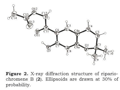 El eupatoriocromeno (1 ) y el ripariocromeno B (2), aislados en buen rendimiento de las raíces de Ageratina arsenei, se estudiaron por difracción de rayos X observándose que en el estado sólido existe una distorsión de la planaridad del sistema bicíclico debida al empaquetamiento cristalino, además de varias interacciones por puentes de hidrógeno clásicos y no clásicos. Los cálculos TFD B3LYP/DGDZVP del eupatoriocromeno (1 ) permitieron la comparación de las distancias de enlace teóricas con las obtenidas del análisis de rayos X, mientras que los cálculos de RMN de los tensores de protección anisotrópica obtenidos con el método GIAO se utilizaron para evaluar las diferencias en los desplazamientos químicos teóricos con respecto a los valores experimentales medidos en CDCl3.