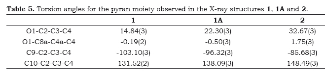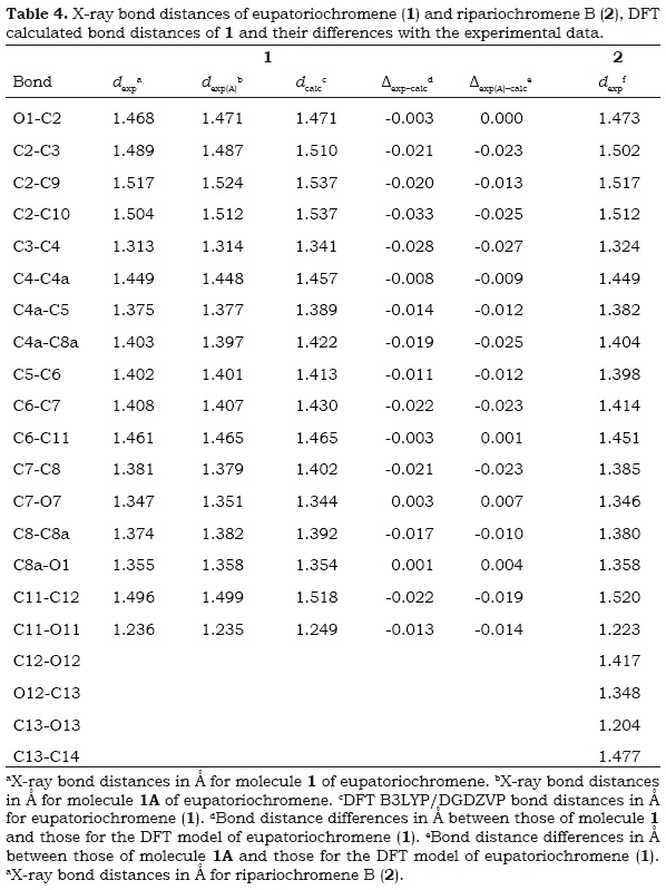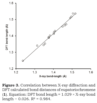 Eupatoriochromene (1) was employed as a model compound to compare the DFT calculated parameters with the C-C and C-O X-ray bond lengths and also with the experimental NMR chemical shifts. A molecular model of eupatoriochromene (1) was constructed using the X-ray diffraction coordinates of 1 and 1A as the starting point for the molecular mechanics calculations that were performed with the MMFF94 force-field. In both cases, the same minimum energy conformer was found for 1 within the energy range of 0-4 kcal/mol. This structure was geometry optimized using DFT calculations with the B3LYP functional and DGDZVP basis set, showing that the chromene bicyclic system becomes planar in the absence of intermolecular interactions (Figure 1). The 13C NMR chemical shifts for eupatoriochromene (1) were calculated from the magnetic shielding tensors obtained through the GIAO method (Jameson 1996) including the solvent effect. The theoretical 13C NMR values of are contrasted in Table 1 with the experimentally measured ones. Also, Table 4 shows that X-ray bond lengths were very close to those calculated using the DFT method. The good correlation between both parameters can be visualized in Figure 3 that reflects the reliability of theoretical data, even though in these calculations, the intermolecular interactions were not considered.