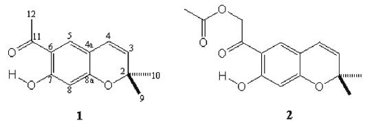 For ripariochromene B (2), a literature search revealed that no 13C NMR data were available. Therefore, an NMR analysis, including 2D experiments, for the total assignment of this compound was undertaken. The 1H and 13C NMR spectral data are listed in Table 1 where it is noteworthy the presence of a typical signal for one bridged hydroxyl hydrogen at δ 12.05 interacting with a carbonyl group. An A2 proton system at δ 5.25 revealed the presence of the CH2-12 and a singlet at δ 2.23 was designated to the methyl group of the acetyl in line with previous reports (Anthonsen 1969). The 13C NMR spectrum displayed at δ 195.0 the signal for the C-11 keto group. The carbonyl ester group appeared at δ 170.4, while C-7 and C-8a attached to oxygen atoms were observed at δ 165.1 and δ 161.0 respectively. The remaining carbons for the aromatic system were detected at δ 126.0 (C-5), δ 113.9 (C-4a), δ 111.1 (C-6) and δ 104.8 (C-8). The vinylic carbons C-3 and C-4 were observed at δ 129.3 and δ 120.6 respectively, and the quaternary C-2 attached to oxygen appeared at δ 78.2. The methylene carbon C-12 at δ 64.4 was confirmed by the DEPT spectrum. The carbons signals for the methyl groups were observed at δ 28.5 for both C-9 and C-10 and at δ 20.5 for the acetyl group. The 13C NMR spectral assignment of 2 was performed by comparison with the 13C NMR data of 1 and was confirmed by the DEPT, HETCOR and HMBC spectra.