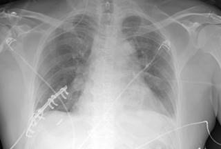 La radiografía de tórax (Figura 5) objetiva que la vía yugular derecha, que era disfuncionante, realiza un bucle hacia arriba, mientras que la vía central yugular izquierda se dirige hacia subclavia izquierda, con la punta situada posiblemente en una vena costoaxilar.