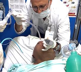 Figura 1: Bajo visualización laringoscópica directa se introduce el catéter DuCanto conectado al ventilador mecánico a la cavidad oral y se coloca la punta en las cuerdas vocales para ventilar al paciente.