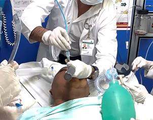 Figura 3: Caso clínico 2, se introduce el catéter en la apertura glótica y se mantiene la ventilación para posteriormente intercambiarlo por un tubo endotraqueal mediante el uso de un Bougie.