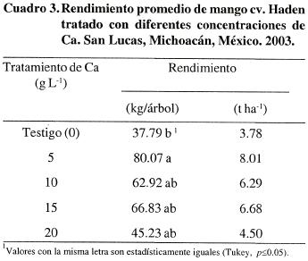 De acuerdo con la prueba de contrastes ortogonales (datos no presentados), los tratamientos que recibieron Ca rindieron más (p<0.05) que el testigo, pero sin diferencias entre las dosis de Ca (Cuadro 3), por lo que con 5 g L1 probablemente sea suficiente. Aunque no se midió el amarre inicial y final de frutos es probable que los tratados con Ca produjeran menos etileno y esto haya reducido la absición de frutos, como sugiere Bangerth (1979). En mango Tommy Atkins, Cracknell et al. (2004) indicaron que los tratamientos bajos en Ca redujeron marcadamente el contenido de Ca en frutos y el rendimiento total, sobre todo en presencia de altas concentraciones de nitrógeno. A este respecto, Hafle et al. (2003) encontraron que las aplicaciones combinadas de nitrato de Ca o de K con etefón en mangos Tommy Atkins indujeron con mayor eficiencia la floración y una alta productividad de frutos, en comparación con aplicaciones únicamente de etefón. Así mismo, Ruby y Brahmachari (2004) mencionaron que aspersiones en precosecha de la combinación de nitrato de Ca a 2%, ácido giberélico a 200 ppm y clormequat a 500 ppm, mostraron resultados promisorios en términos de rendimiento en el cv. Amrapali. Sánchez y Durand (2000) encontraron en tres cultivares de mango que el nitrato de Ca a 6% elevó significativamente el número de frutos cuando fue complementado con nitrato de Ca y boro aplicados al suelo después de floración. Ram et al. (2002) reportaron rendimientos máximos para el cv. Dashehari, de 67.68 kg/árbol y mínimos de 38.44 kg/árbol cuando no recibieron fertilización con NPK.