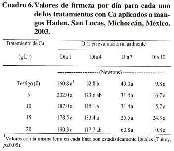 El análisis no detectó diferencias significativas entre los tratamientos de Ca y el testigo en los frutos evaluados (Cuadro 4), aunque los frutos tratados con 10 y 20 g Ca L1 fueron 34% (24.4 N) más firmes que el testigo. Esto explica que se haya encontrado una correlación significativa (p<0.05) (r= 0.53) entre firmeza y concentración de Ca en la pulpa. Se observaron diferencias significativas entre los días de evaluación después de la cosecha, aunque el menor valor se observó al final del período de evaluación (Cuadro 5). Durante los primeros cuatro días de la maduración, la pérdida de firmeza resultó más acelerada en el testigo junto con la dosis de 20 y 5 g Ca L1(Cuadro 6). De acuerdo con ContrerasMartínez et al. (2003), valores de firmeza por debajo de 20 N indican pérdida de la calidad en frutos de mango Keitt; estos autores señalaron que en el cv. Tommy Atkins el valor de 20 N se alcanzó después de nueve días de almacenamiento a temperatura ambiente. En el presente experimento los frutos presentaron valores mayores que 20 N después de nueve días de exposición a las condiciones de maduración establecidas. La mayor disminución de firmeza ocurrió entre el sexto y noveno días después de la cosecha (Cuadro 6), lo que coincide con el máximo climatérico alcanzado en el sexto día después del corte.