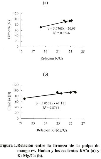 Cracknell y Galán (2002) observaron una relación negativa entre Ca y el desorden fisiológico conocido como descomposición interna, ya que valores altos (94) de N/Ca, P/Ca, K/Ca y Mg/Ca en el mesocarpio de mango propiciaron la incidencia de dicho desorden, mientras que cuando la relación N/Ca fue baja (17) y la relación Ca/Mg+N se incrementó, la incidencia del desorden disminuyó. Según Cracknell y Galán (2004), las altas concentraciones de Ca y Mg y las bajas relaciones de N/Ca y K/Ca en pulpa y cascara son eficientes para prevenir desórdenes fisiológicos en frutos de mango. En el presente trabajo los valores de las relaciones K/Ca resultaron inferiores a los reportados en la literatura y los frutos no presentaron ningún desorden fisiológico (Cuadro 2).