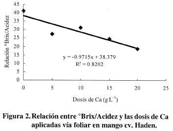 En esta relación no se detectaron diferencias significativas entre los tratamientos con Ca y el testigo (Cuadro 4); sin embargo, la diferencia relativa entre el testigo y la dosis más alta de Ca (20 g L1) fue de 55% a favor del primero; tampoco resultó significativa la interacción. La mayoría de éstos valores son menores de 25, el mínimo requerido en mangos cv. Keitt (CamposSauceda et al., 2003). Se observó que la relación °Brix/Acidez tendió a disminuir conforme la dosis de Ca se incrementó; esto explica que en el análisis de regresión para°Brix/Acidez y las dosis de Ca se encontrara un coeficiente R = 0.82 (p<0.05) (Figura 2), lo que demuestra que hubo un efecto del Ca sobre el retraso en la evolución de la maduración, al permitir que los frutos conservaran mayor acidez.