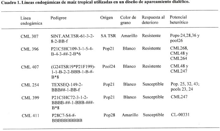 Seis líneas endogámicas tropicales de maíz (F=l) previamente caracterizadas por su resistencia al deterioro acelerado (Cuadro 1) fueron cruzadas para generar el dialélico completo que incluye las cruzas directas, recíprocas y los progenitores (Método I de Griffing, 1956).