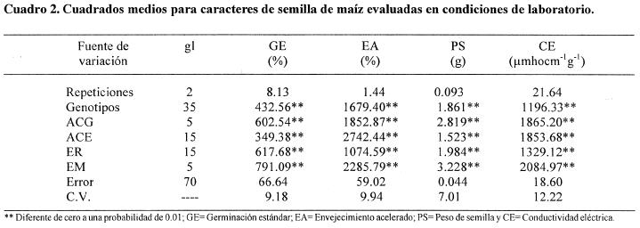 Se observaron diferencias significativas entre genotipos (p<0.01) para todos los caracteres de calidad de la semilla evaluados (Cuadro 2); siendo éstos el porcentaje de germinación estándar (GE), el vigor a través de la prueba de envejecimiento acelerado (EA) seguida por una prueba de GE, el peso de la semilla (PS) y conductividad eléctrica (CE). Con base en la descomposición de los cuadrados medios de los genotipos se encontró que la ACG, ACE, ER y EM también presentaron efectos significativos (p<0.01), en este grupo de caracteres.