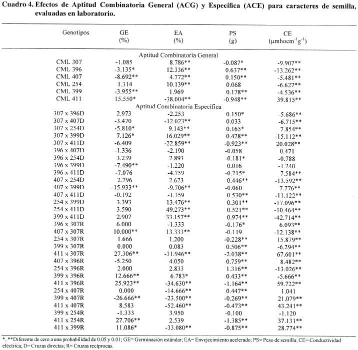 La línea CML 411 presentó la mayor ACG para germinación estándar (Cuadro 4); así mismo, mostró la más alta ACG en la prueba de conductividad eléctrica, aunque este carácter se correlaciona negativamente con el vigor de la semilla (AbdulBaki y Anderson, 1973; Yaklich et al, 1979; Matthews y Powell, 1981), por lo que fue consistente al obtener el valor más bajo de ACG para vigor a través de la prueba de EA.