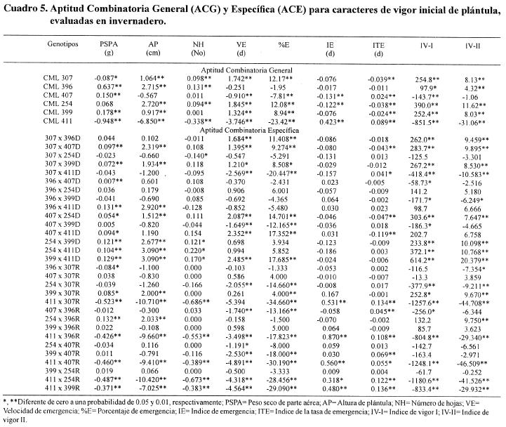 La cruza CML 254 x CML 411 igualó el valor de ACE para AP y fue mejor que todas en el NH a los 24 DDS (Cuadro 5). Hubo poca consistencia entre las líneas con la mejor ACG y las combinaciones para ACE; a este respecto Revilla et al. (1999) señalaron que existe mayor avance genético al seleccionar combinaciones de híbridos específicos para vigor inicial de plántula de maíz, que seleccionando líneas con base sólo en efectos de ACG.