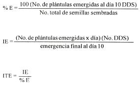 Los conteos de emergencia fueron hechos a los 7, 8, 9 y 10 días después de la siembra (DDS) y los valores obtenidos fueron usados para estimar el porcentaje de emergencia (%E), índice de emergencia (IE) y el índice de la tasa de emergencia (ITE) tal y como lo describieron Fakorede y Ayoola (1980) y Fakorede y Ojo (1981) mediante la fórmula siguiente: