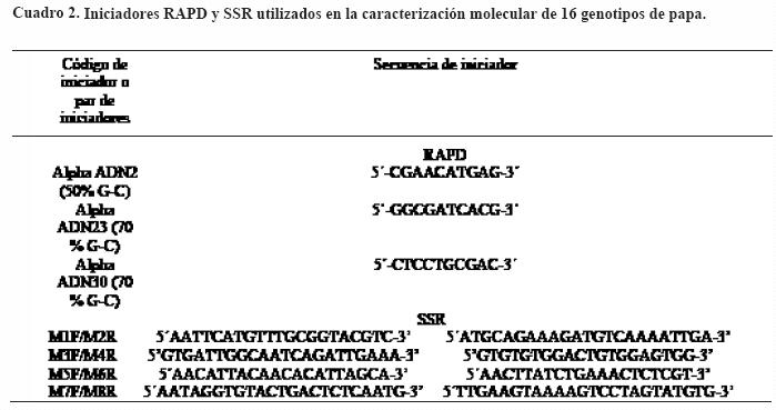 En el análisis de microsatélites inicialmente se evaluaron seis pares de iniciadores reportados por Ashkenazi et al. (2000) y Ghislain et al. (2000) y con base en el polimorfismo generado se seleccionaron cuatro (Cuadro 2). Las condiciones de reacción utilizadas fueron: en un volumen final de 25 µl se mezcló solución amortiguadora al 1X, 2 mM de MgCl2, 200 µM de dNTP's, 0.5 µM de cada iniciador, 2.5 unidades de Taq polimerasa, 2 µl de ADN (50 ng) y 12.5 µl de agua estéril. Las condiciones de la PCR fueron las siguientes: a) 3 min a 94 °C; b) 35 ciclos de 1 min a 94 °C; 2 min a 47 °C y 1.5 min a 72 °C; con una extensión final de 5 min a 72 °C. Los productos de amplificación se fraccionaron en geles de poliacrilamida al 6% y se tiñeron con bromuro de etidio para ser visualizados en una fuente de luz ultravioleta y ser fotografiados.