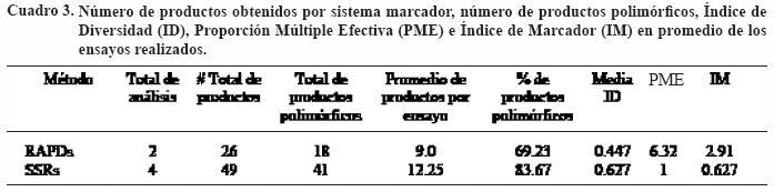 Comparación de la utilidad de los tipos de marcadores. Con el fin de estimar la utilidad de cada sistema de marcadores se calcularon algunos parámetros reportados por Powell et al. (1996), como el Índice de Diversidad (ID), la Proporción Múltiple Efectiva (PME) y el Índice de Marcador (IM) para cada iniciador o par de iniciadores evaluados por sistema de marcadores moleculares. Los altos o bajos niveles de polimorfismo determinan el ID genética presente en un grupo de individuos. En este caso se observó un ID de 44.7 y 62.7% en los genotipos evaluados para RAPD y SSR, respectivamente. En el Cuadro 3 se muestra un resumen de las medias aritméticas para la PME de cada sistema de marcadores. El promedio de PME en RAPD fue de 6.32, mientras que para los SSR fue de 1. En el caso de los SSR esto fue debido a que este sistema de marcador sólo revela un locus simple. En cuanto al IM fue de 2.91 y 0.627 para RAPD y SSR, respectivamente.