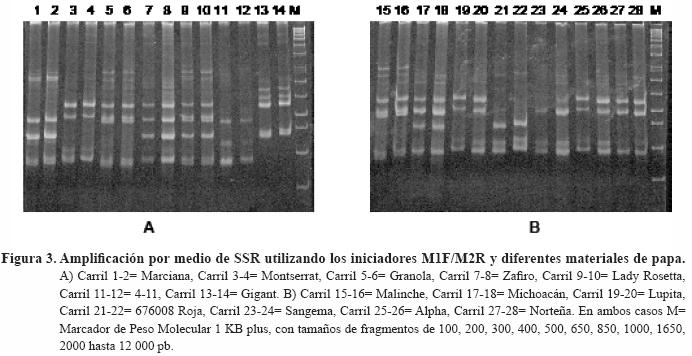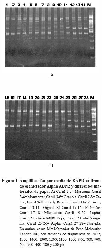 Análisis RAPD. Las tres reacciones de amplificación de RAPDs y las cuatro de SSR amplificaron un total de 75 productos lo que permitió caracterizar el germoplasma evaluado. En general, el análisis RAPD amplificó un total de 26 fragmentos (en promedio 9.0 fragmentos por iniciador), de los cuales 18 (69.23%) fueron polimórficos. El tamaño de los fragmentos analizados fue de 200 a 2000 pb aproximadamente, aunque se observaron fragmentos de mayor y menor tamaño (Figuras 1 y 2). No se detectaron diferencias significativas en el número de fragmentos amplificados entre los iniciadores utilizados (datos no mostrados). En las mismas figuras se muestran dos repeticiones por cada genotipo evaluado para estar seguros que los resultados obtenidos son confiables y reproducibles, además se demostró que no hubo variación dentro de las líneas y variedades de papa.