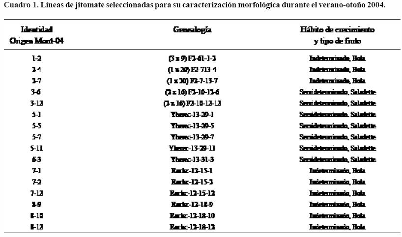 La investigación se llevó a cabo en dos experimentos en el Colegio de Postgraduados, en Montecillo, Texcoco, Estado de México. En 2003 se incrementó la semilla de 21 líneas de jitomate en sistema hidropónico bajo invernadero en el ciclo otoñoinvierno. En 2004 se seleccionaron 16 líneas por caracteres deseables tales como número de frutos por planta, tipo de fruto y hábito de crecimiento, para ser caracterizadas (Cuadro 1). Para ello, el ensayo se condujo bajo invernadero y en el laboratorio se realizaron diversas mediciones que se describen adelante.