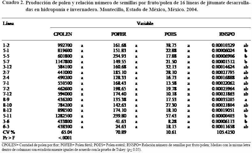 Los análisis de varianza para la cantidad de polen, fertilidad y la esterilidad del mismo no mostraron diferencias estadísticas entre líneas; en cambio para la relación número de semillas por fruto/polen sí se encontraron diferencias significativas (Cuadro 2). La presencia de polen estéril en las líneas de jitomate se debió a fallas durante la microsporogénesis; sin embargo, la cantidad de polen fértil fue suficiente para fertilizar los óvulos. Georgiady y Lord (2002) señalan que la producción de polen resulta de una combinación de la reducción en el reclutamiento de células esporógenas y la menor proliferación de esas células. En la relación semilla por fruto por polen, las líneas más eficientes fueron 89, 63 y 12 las cuales mostraron la mayor producción de semilla y polen.