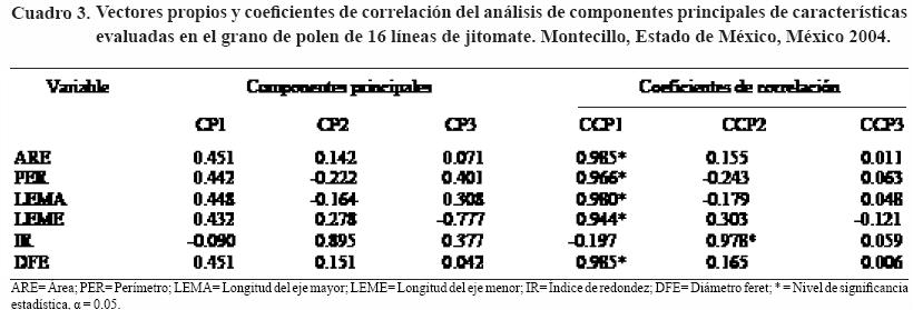 El análisis de componentes principales de los seis caracteres evaluados en el grano de polen (área, perímetro, longitud del eje mayor, longitud del eje menor, índice de redondez y diámetro feret) indicó que con los dos primeros componentes (CP1 y CP2) se explicó el 100% de la variabilidad que mostraron los granos de polen (Cuadro 3).