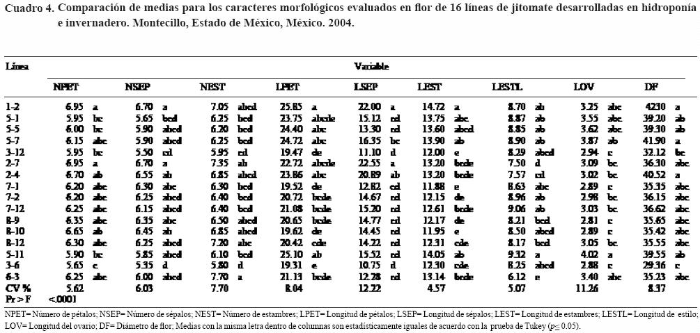 Se detectaron diferencias significativas en la longitud del estilo. La línea sobresaliente en longitud de estilo fue la 712 (Cuadro 4). De acuerdo con Georgiady y Lord (2002) en Lycopersicon pimpinelifolium, las diferencias encontradas en la longitud del estilo se atribuyen a diferencias en el número de células o al lento crecimiento celular, por tanto, un estilo extremadamente pequeño evita la buena germinación del grano de polen.