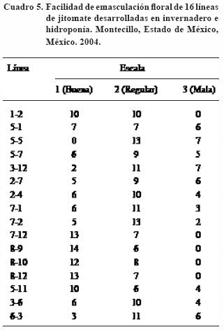 En el 2004, para la evaluación de 16 genotipos se utilizó un diseño completamente al azar con cuatro repeticiones, donde la unidad experimental constó de dos plantas. Al iniciar la etapa reproductiva de las plantas se realizó la caracterización morfológica de planta, flor, polen y fruto, y consistió en lo siguiente: para el número de racimos, frutos y frutos con deficiencia de calcio (ésta sólo se cuantificó en la planta completa) se utilizaron dos plantas por repetición; la longitud y diámetro de fruto, número de lóculos y peso del fruto se evaluaron en 10 frutos por repetición; la longitud de sépalos, pétalos, estambres, ovario y estilo, número de sépalos, pétalos y estambres, y el diámetro de flor se cuantificaron en cinco flores tomadas al azar de cada repetición; mientras que para la cantidad de granos de polen, fertilidad, esterilidad, tamaño y forma del grano de polen (µm) se colectó polen de una flor por repetición. Para la esterilidad y fertilidad de granos de polen se colocó polen sobre un portaobjetos y se agregó una solución de rojo carmín propiónico al 1% de tal forma que los granos fértiles se tiñeron de rojo y en los estériles sólo se marco el contorno. En cuanto a la facilidad de emasculación floral ésta se midió en tres escalas (buena, regular y mala) empleando cinco flores por repetición. Con respecto a la eficiencia en la polinización se determinó en el número de semillas por fruto, peso de mil semillas y el peso hectolítrico de la semilla se determinó en la semilla obtenida de 10 frutos de cada repetición.