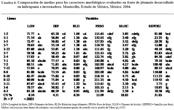 Se detectaron diferencias estadísticas altamente significativas (p=0.01) entre líneas para las variables evaluadas en fruto. La comparación de medias indica que en la longitud de fruto las líneas 12 y 55 fueron superiores a las demás, en tanto que las 712 y 24 presentaron la menor longitud (Cuadro 6). Para la variable diámetro de fruto, 812, 71 y 810 superaron al resto de las líneas. Respecto al peso de fruto, las 71 y 810 resultaron sobresalientes con 230.88 y 218.10 g, respectivamente, siendo la 36 la de menor peso. Las líneas 63 y 36 presentaron el mayor y menor número de lóculos respectivamente. Con relación al número de semillas por fruto, 89 fue la de mayor producción en comparación con las demás, mientras que la de menor producción de semilla fue la 511.