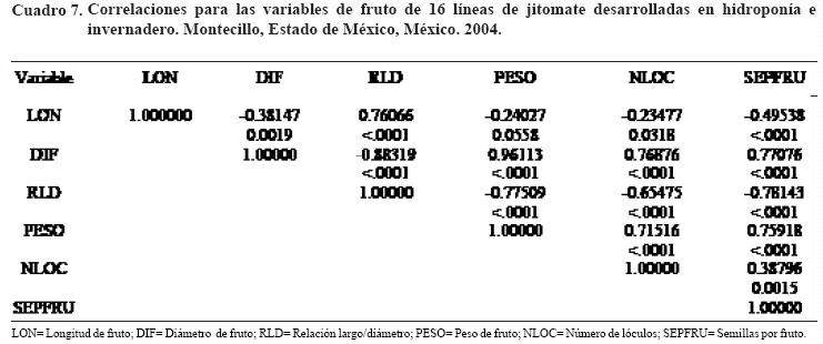 En las variables evaluadas en fruto se observó que la longitud de fruto se correlacionó con la relación largo/diámetro, al mismo tiempo indicó el tipo de fruto al que corresponde, ya que al haber un incremento en la longitud la relación largo/diámetro se identifica a un fruto tipo saladette (Cuadro 7).