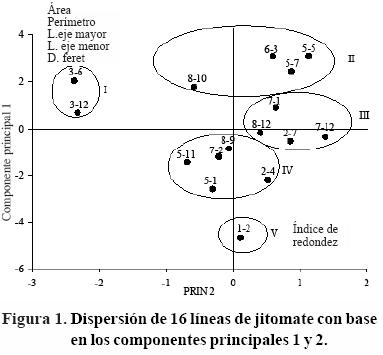 En la Figura 1 se observa la dispersión de las 16 líneas sobre el plano determinado por los dos primeros componentes principales, pudiendo definirse cinco grupos. El CP1 separa claramente a los grupos I y II de los grupos IV y V, quedando el grupo III intermedio. Los grupos I y II presentan los granos de polen más grandes y de forma menos esférica, incluso los del grupo I tienden a ser elípticos; mientras que en los grupos IV y V sus líneas presentan granos de polen con menores dimensiones en área, perímetro, longitud del eje mayor, longitud del eje menor y diámetro feret y de forma redonda; estos últimos grupos se distinguen por estar dentro del rango promedio en producción de granos de polen, semilla y fruto en comparación de los grupos I y II. Al respecto, Picken (1984) señaló que la producción, fertilidad y tamaño de polen son caracteres sensibles a períodos de baja luminosidad, los cuales causan deficiencia de carbohidratos que ocasionan variación en la forma y tamaño en los granos de polen en desarrollo, teniendo como consecuencia una reducción en la producción de semilla y cuajado del fruto.
