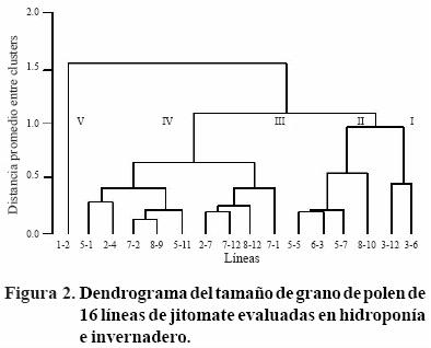 La distribución de las líneas en la Figura 1, obtenida con los componentes principales concuerda estrechamente con el análisis de conglomerados (Figura 2), ya que a una distancia euclidiana de 0.60 se identificaron cinco grupos, cada uno de ellos formados por las líneas de jitomate con características similares de grano de polen.