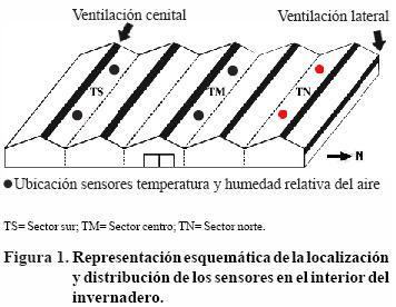 Para llevar a cabo la evaluación microclimática de los invernaderos se seleccionaron tres sectores en su interior, resultando así los siguientes tratamientos: sector norte (TN), sector centro (TM) y sector sur (TS). En cada uno de los tratamientos se colocaron dos sensores (dos repeticiones) para medir las variables climáticas de temperatura y humedad relativa (Figura 1).