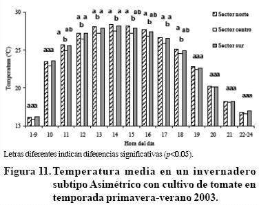 Con respecto a la variable temperatura, los resultados estadísticos indicaron que existió diferencias significativas (p<0.05) entre tratamientos (Figura 11). Estas diferencias iniciaron a las 11:00 h y terminaron a las 18:00 h. El sector que causó estas diferencias fue el centro con un diferencial de 0.7 °C (3%) con respecto al TN y TS. Para esta temporada y en este tipo, las temperaturas fueron muy homogéneas en todo el invernadero.