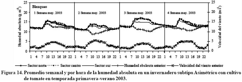 Los mayores valores de humedad absoluta (Figura 7) se presentaron en el TM y los menores valores fluctuaron según el manejo realizado al sistema de ventilación natural mencionado anteriormente. En la cuarta semana del mes de abril se blanqueó, es importante destacar que esta práctica reduce los valores de la humedad absoluta del aire a sus niveles iniciales (10 a 15 g m3). Lo anterior, refuerza la teoría de que la principal fuente de humedad absoluta en el interior del invernadero es la evapotranspiración del cultivo. Si esta teoría es verdadera, entonces, la evapotranspiración presentaría una relación inversamente proporcional con la radiación solar incidente en el interior de estas estructuras hasta un cierto límite.