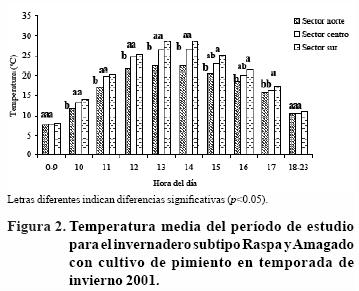 Los resultados indican que con respecto a la variable temperatura se encontraron diferencias significativas (p<0.05) entre tratamientos (Figura 8). Estas diferencias iniciaron a las 10:00 h y terminaron a las 18:00 h. El sector que causó estas diferencias fue el TN con un diferencial de 2.0 °C con respecto al TM. Es importante destacar que en esta estructura de invernadero, la máxima temperatura se encuentra localizada en el TM.