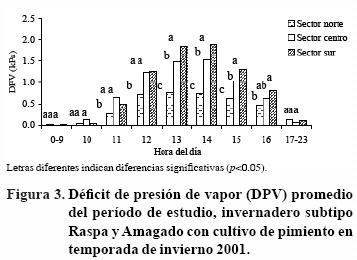 El déficit de presión de vapor (DPV) representa la demanda evaporativa de la atmósfera circundante y, por lo tanto, es un indicador de primer orden en la respuesta de la planta al ambiente (PérezParra et al., 2001). Los resultados encontrados para el DPV, indican que el TN obtiene los menores valores de DPV (Figura 3). Este menor valor coincide con una menor temperatura en este sector. Sin embargo, las pequeñas diferencias en la temperatura del invernadero causan 70% de diferencias en el DPV, en las horas centrales del día. Teóricamente, esto ocasionará diferencias en la precocidad del fruto entre sectores, tal como lo afirma LópezGálvez (1990), al mencionar que las variaciones de radiación solar incidente, sobre el cultivo de frijol, produjeron zonas de precocidad variable en el eje nortesur del invernadero.