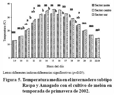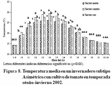 Aunque no se midió la radiación incidente, se estima que esta variación entre sectores coincide teóricamente con la cantidad de radiación solar captada en cada uno de ellos (Muñoz et al., 1999; Maroto, 2000; Tesi, 2001) y, como lo señalan varios autores que han estudiado este tipo de invernaderos: "la vertiente sur del invernadero recibe 70% de radiación exterior, mientras que la vertiente norte sólo 50%" (LópezGálvez, 1990; LópezHernández, 1990). Otra teoría que respalda la anterior estimación es sobre el grado de inclinación de los rayos solares, el cual es mayor en la temporada de invierno (Bot, 1983).