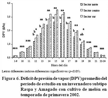 El sector norte obtuvo los menores valores de DPV (Figura 6). Estas tendencias se mantuvieron dentro del período de estudio, a excepción de la primera semana de febrero en donde el cultivo se encontró dentro de las primeras etapas de desarrollo. Después del blanqueo, el microclima fue más homogéneo siendo mínimas las diferencias en el interior del invernadero para esta variable en la última semana del mes de abril.
