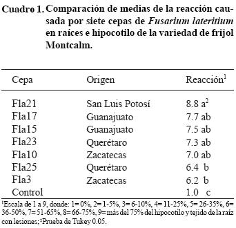 La reacción de la variedad Montcalm a la inoculación de las cepas de F. lateritium, fue evaluada con la escala visual de daño creada por el Centro Internacional de Agricultura Tropical (CIAT, 1987) para F. solani. La escala incluye nueve valores: 1= 0%; 2= 15%; 3= 610%; 4= 1125%; 5= 2635%; 6= 3650%; 7= 5165%; 8= 6675%; 9= más del 75% del hipocotilo y tejido de la raíz con lesiones. Las plantas control (sin inocular) fueron evaluadas de igual manera. Los valores de 1 a 3 fueron categorizados como una reacción resistente; de 4 a 6, reacción intermedia y de 7 a 9, susceptible. El promedio de la reacción de las tres plantas de cada repetición fue sometido a un análisis de varianza con un diseño al azar y las medias fueron comparadas con la prueba de Tukey (p<0.05).