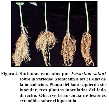A los siete días después de la inoculación, las raíces secundarias de las plantas inoculadas mostraron un cambio de coloración de claro a café rojizo, comparado con el control sin inocular. Lesiones similares han sido reportadas para F. semitectum (Dhingra y Muchovej, 1979) y F. solani (Bolkan, 1980) sobre frijol. Dhingra y Muchovej (1979) indicaron quelas lesiones causadas por F. semitectum son similares a las causadas por Rhizoctonia solani; sin embargo, los síntomas causados por este hongo se diferencian claramente de los daños causados por F. lateritium sobre frijol. Aunque la descripción de síntomas sobre el hipocotilo y la raíz principal causados por F. solani es similar a los síntomas causados por F. lateritium, las dos cepas de F. solani utilizadas no causaron síntomas confundibles al nivel del hipocotilo entre las dos especies sobre la variedad Montcalm (Figura 4), la cual fue reportada como susceptible a F. solani por Schneider y Kelly (2000).