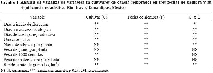 Se registraron datos de: días a inicio de floración (IF) y madurez fisiológica (MF), duración en días de la etapa reproductiva (ER), acumulación de unidades calor (UC), número de silicuas (NSP), peso de grano por planta (PGP), peso de 1000 semillas (P1000S), peso de materia seca a la cosecha (PMS) y el rendimiento de grano (RG) en kg ha1. La cosecha se efectuó en forma manual y el corte de plantas se realizó conforme cada cultivar llegaba a madurez de cosecha cuando el grano contenía una humedad de 10 a 13 % la cual se ajustó a 10%. Se practicaron análisis de varianza por fecha de siembra y análisis combinado de las tres fechas de siembra utilizando la versión 6.12 de SAS (SAS, 1995), y para comparar diferencias entre medias se utilizó la prueba deTukey (p<0.05).