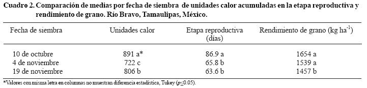 En el Cuadro 2 se muestra que las UC, ER y RG, mostraron diferencia significativa entre fechas. En la fecha de siembra de 10 de octubre se registraron las mayores acumulaciones de UC, esto asociado a que en el IF [50 a 60 días después de la siembra (DDS)] las temperaturas máximas estuvieron cercanas a 25 °C y después de esta etapa y hasta MF (135 a 150 DDS) se mantuvieron entre 15 a 22 °C. En la siembra de 4 de noviembre se registraron las menores acumulaciones de UC, donde las temperaturas máximas fluctuaron entre 15 y 18 °C desde la etapa de IF (60 a 70 DDS) hasta MF (120 a 135 DDS). De forma opuesta a lo observado en la fecha de 10 de octubre, en la fecha de 19 de noviembre las temperaturas máximas registradas durante la etapa de IF (65 a 80 DDS) fluctuaron entre 16 y 24 °C, mientras que para MF (13 0 a 140 DDS) estuvieron cercanas a 25 °C (Figura 1). La mayor duración de la etapa reproductiva fue en la fecha de 10 de octubre (Cuadro 2) y puede ser consecuencia de diferentes factores, entre ellos a la interacción cultivar por fecha de siembra y a la precocidad a IF por altas temperaturas, particularmente en esa fecha, durante el período vegetativo (datos no incluidos).