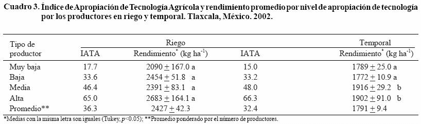 Los productores de Tlaxcala detentan en promedio 2.34 ha, los de muy baja apropiación tienen 1.98 y los de baja, media y alta poseen 2.36, 2.55 y 3.04 ha, respectivamente. Por otra parte, el 96.4% de la superficie es de temporal y 3.6% de riego. La tenencia de la tierra bajo riego es de 0.03, 0.08, 0.14 y 0.23 ha, para productores de muy baja, baja, media y alta apropiación, respectivamente. El IATA y el rendimiento promedio fueron mayores en la agricultura de riego en comparación con la de temporal aunque no se encontraron diferencias significativas entre los tipos de productores. En la agricultura de temporal se observó diferencia entre las medias de rendimiento de los productores de muy baja y baja apropiación, respecto a los de media y alta (Cuadro 3).