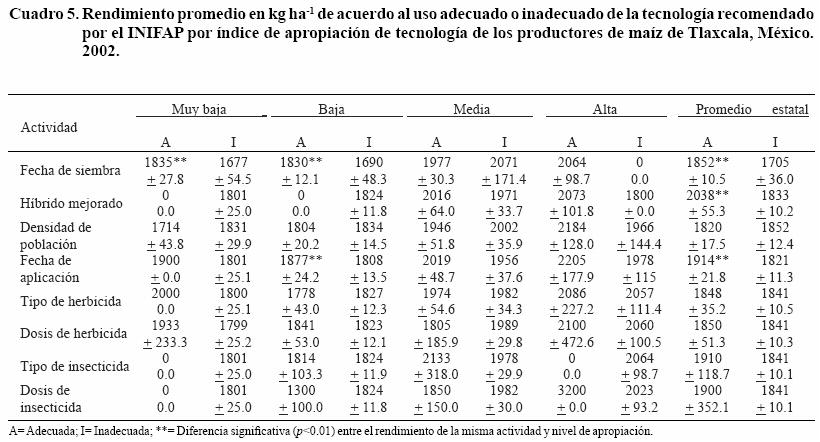 La discontinuidad productiva y el atraso tecnológico de los productores se manifiesta en la amplia variación observada en las prácticas agrícolas que utilizan en el cultivo de maíz, como son: 5 fechas de siembra, 13 híbridos mejorados, 17 y 20 distancias entre surcos y matas, 4 cantidades de plantas por mata, 7 tipos y 10 dosis de herbicidas, 5 8 fórmulas y 12 fechas de aplicación de fertilizante y 12 tipos y 18 dosis de insecticidas. Además de lo anterior, se evaluó la aplicación incorrecta del paquete tecnológico, ya que, sólo la fecha de siembra recomendada fue la utilizada por 92.9% de los productores; en contraste, los híbridos recomendados no fueron utilizados por 96.2% de los productores, al igual que la densidad de población (66.3%), dosis de fertilización (100%), fecha de aplicación del fertilizante (78.5%), tipo (92.7%) y dosis de herbicida (96%) y tipo (99.5%) y dosis de insecticida (99.7%). El uso adecuado de la tecnología se traduce en mayor rendimiento, sobre todo entre productores con menor índice de apropiación tecnológica (muy baja y baja), donde se encontraron diferencias significativas en fecha de siembra y fecha de aplicación de fertilizante (Cuadro 5).