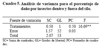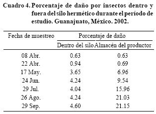 El porcentaje de daño por insectos dentro y fuera del silo se incrementó en forma continua durante el período de almacenamiento; sin embargo, el daño dentro del silo fue cinco veces menor al compararlo con el daño observado en el almacén del productor. El daño máximo observado fue de 21.15% bajo las condiciones de almacenamiento del productor (Cuadro 4), porcentaje similar al reportado por Aguilera (1988e).