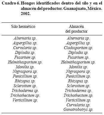 Se identificaron 14 géneros de hongos dentro del silo y 16 bajo las condiciones de almacenamiento del productor (Cuadro 6).