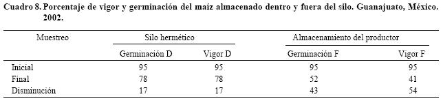 El vigor y la germinación de la semilla dentro del silo tuvo una disminución de alrededor de 17% durante el período de almacenamiento, mientras que fuera del silo, es decir, bajo las condiciones de almacenamiento del productor la disminución fue casi de 50% (Cuadro 8).