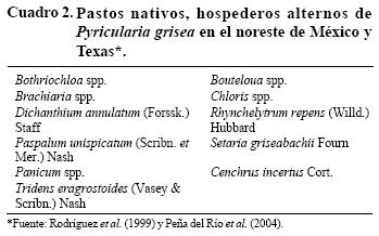 Epidemiología. En general, el conocimiento sobre los aspectos de la epidemia de Pyricularia grisea en pastos es limitado. Estudios realizados en condiciones controladas con ryegrass (Lolium multiflorum Lam. y L. perenne L.) indicaron que las temperaturas óptimas para la infección de P. grisea oscilaron en el rango de 25 a 29 °C (Moss y Trevathan, 1987; Landschoot, 1992). En L. multiflorum, los primeros síntomas de la enfermedad se registraron a las dos semanas de emergidas las plantas y el mayor número de lesiones ocurrió a partir de las 4.5 semanas. A temperaturas de 35 ó 5 °C la infección fue mínima. Con un período de 24 h a punto de rocío lo cual fue suficiente para registrar la infección máxima, por lo que este puede ser un factor crítico para el desarrollo de la enfermedad (Moss y Trevathan, 1987). Observaciones sobre el desarrollo del tizón foliar del buffel bajo condiciones de campo indicaron que la mayor severidad se asoció con humedad relativa superior a 75% en períodos de 8 a 10 h (Rodríguez et al., 1999). Este hongo se perpetúa de un ciclo o año al otro en residuos de cultivos infectados y en pastos espontáneos, que pueden actuar como fuente de inóculo primario para el subsiguiente desarrollo de la enfermedad. Al respecto, se han identificado al menos 11 especies de pastos nativos infectados con Pyricularia grisea en el noreste de México y Texas (Rodríguez et al. 1999; Peña del Río et al., 2004) (Cuadro 2). Rodríguez et al. (1999) y González (2002) indicaron que los daños en buffel varían según la severidad de la enfermedad, sus resultados registraron pérdidas de 30% en materia seca digestible.