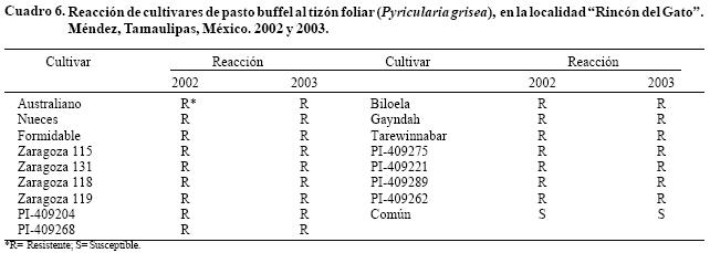 Los cultivares de pasto buffel introducidos, mostraron en ambos años una consistente reacción de resistencia al tizón, mientras que la variedad Común manifestó susceptibilidad (Cuadro 6). Estos resultados confirman los obtenidos en el muestreo regional (Díaz y Méndez, 2005) donde Nueces, Formidable y PI409275 registraron baja severidad y demuestran la existencia de cultivares de buffel con resistencia a la enfermedad. Sin embargo, no coinciden con lo reportado por Ocumpaugh y Rodríguez (1998), quienes en Texas calificaron a Nueces y Biloela como susceptibles. Según Garza (2004) y Herrera (2004), la reacción de cultivares de buffel a P. grisea puede inclusive diferir entre localidades o entre años. Al respecto, Herrera (2004) identificó ocho materiales como susceptibles en 2002 y los mismos fueron resistentes en 2003. Perrot y Chakraborty (1999) y Zeigler y Correa (2002), señalaron que P. grisea muestra una gran variabilidad patogénica, por lo que el hongo es capaz de generar nuevas razas fisiológicas o biotipos; esto podría dar una explicación a la variación de respuesta observada entre los cultivares de buffel.