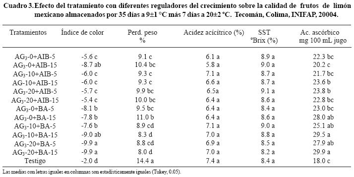 Los parámetros de calidad interna de los frutos, indican valores mayores en acidez, en los tratamientos AG310+BA15, AG320+BA15 y el testigo presentando (8.1, 8.3 y 7.8), en este caso se marcaron diferencias estadísticas con respecto al resto de los tratamientos. En cambio en el contenido de ácido ascórbico no se presentaron diferencias estadísticas manteniendo en este parámetro valores entre 42.5 y 48.8 mg de ácido ascórbico /100 mL de jugo; en cuanto al contenido de sólidos solubles totales (°Brix) en los frutos del tratamientos AG320+BA15 se presentó el, valor menor (7.2%), marcando con este diferencias estadísticas con respecto al resto de los tratamientos, lo cual concuerda con lo reportado por Pozo et al. (2000) que señalaron que las aspersiones con AG3 redujeron temporalmente el contenido de grados °Brix del jugo de la tangerina 'Sunburst' ya que en el caso de limón mexicano, al aplicarse estos reguladores se observaron menores cantidades de °Brix, mayor acidez en el jugo y color más verde en la cáscara de los frutos de los tratamientos con mayores concentraciones de ácido giberélico y benciladenina (Cuadro 1).